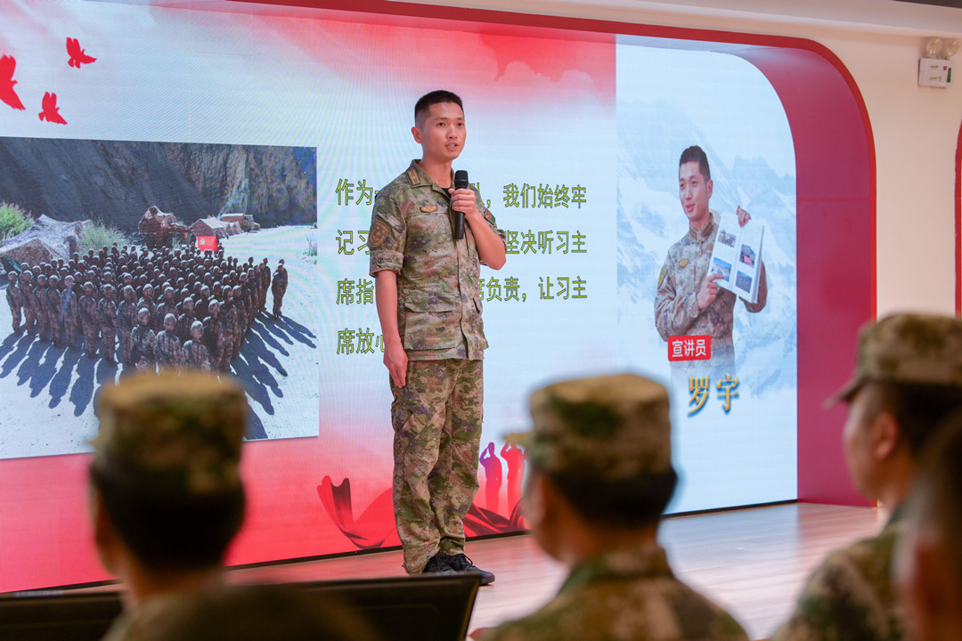 現(xiàn)場,新疆高原69316部隊(duì)邊防一營副政治教導(dǎo)員、優(yōu)秀共產(chǎn)黨員羅宇,中國人民解放軍91878部隊(duì)上尉干事郭開強(qiáng),69316部隊(duì)邊防三營五連一班班長張長城3位部隊(duì)宣講員激情開講,分享感人的軍旅故事。  羅宇分享軍旅故事。記者 易承樂 攝