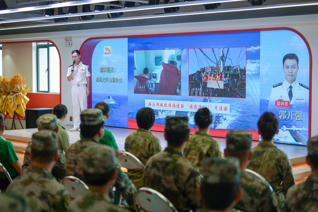 郭開強(qiáng):勇闖大洋 為國爭光 2008年12月,應(yīng)聯(lián)合國授權(quán)請(qǐng)求,奉中央軍委命令,南海艦隊(duì)武漢艦、??谂灐⑽⑸胶灲M成第1批護(hù)航編隊(duì),拉開了人民海軍舉世矚目的亞丁灣、索馬里護(hù)航序幕,這是自600多年前鄭和下西洋以來,中國真正意義上的遠(yuǎn)海非戰(zhàn)爭軍事行動(dòng),開啟了人民海軍從“黃水”駛向“藍(lán)水”的壯麗航程。 91878部隊(duì)郭開強(qiáng)干事為大家?guī)碇黝}宣講《勇闖大洋 為國爭光》。 郭開強(qiáng)介紹—— 迄今為止,人民海軍已累計(jì)派出44批100余艘次艦艇參加亞丁灣、索馬里海域護(hù)航,完成1500多批7000余艘中外船舶護(hù)航任務(wù),解救、接護(hù)各類船舶近百艘,其中外國船舶超過50%。 護(hù)航官兵一次次直面生死、一次次化解危機(jī)、一次次挑戰(zhàn)極限,用忠誠與奉獻(xiàn)、責(zé)任與擔(dān)當(dāng),彰顯大國海軍形象,譜寫了人民海軍邁向世界一流海軍的新時(shí)代壯歌。 張長城分享軍旅故事。記者 易承樂 攝