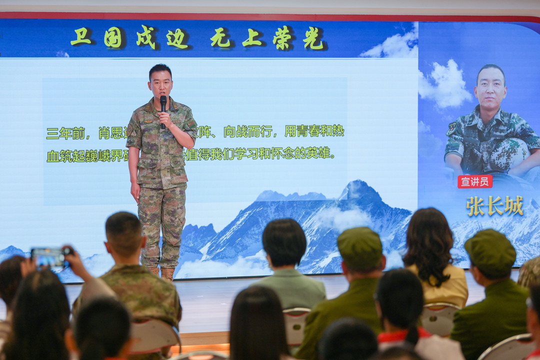 張長城:肖思遠(yuǎn)的名字永遠(yuǎn)留在連隊(duì) “我是69316部隊(duì)加勒萬邊防連‘肖思遠(yuǎn)班’班長張長城,很高興今天有機(jī)會(huì)跟大家進(jìn)行交流。三年前,肖思遠(yuǎn)班長兩闖敵陣、向戰(zhàn)而行,用青春和熱血筑起巍峨界碑,是永遠(yuǎn)值得我們學(xué)習(xí)和懷念的英雄……” 張長城現(xiàn)場作了主題為《衛(wèi)國戍邊 無上榮光》的宣講。 張長城說—— 肖班長犧牲后,連隊(duì)組建了“肖思遠(yuǎn)班”,班里有一張肖班長的床,每天晚上,戰(zhàn)士們都會(huì)將肖班長的被子打開,早上起床再將被子工工整整的疊好;晚上點(diǎn)名,班里的同志輪流向肖班長匯報(bào)本班和個(gè)人的工作。 連隊(duì)每天的點(diǎn)名,呼點(diǎn)的第一個(gè)名字永遠(yuǎn)是“肖思遠(yuǎn)”,全連齊聲答“到、到、到”,那一刻,感覺下面所有人,望過去都是他! ▌與現(xiàn)場基層干部群眾互動(dòng)交流
