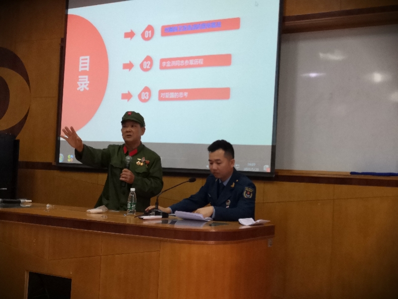 李金洪與陳偉樂兩代退役軍人同臺(tái)講述崢嶸歲月。 由于身體不適,李金洪無法長時(shí)間親述那段崢嶸歲月,但是這位老兵又是那么熱心地想讓更多后輩知道祖國的不容易,人民當(dāng)今幸福生活的來之不易,毅然接受邀請(qǐng),克服身體不適,再次走上講臺(tái),結(jié)合親身經(jīng)歷給在場師生講述1979年那段崢嶸歲月。李金洪表示,軍人的使命是保衛(wèi)祖國,抵抗侵略,“如果再給我選擇的機(jī)會(huì),我還是義無反顧上戰(zhàn)場,我們有偉大的共產(chǎn)黨、有偉大的制度、有偉大的祖國和人民,我們應(yīng)該為自己是一名中國人和生活在祖國的大地上感到驕傲和自豪”。 此次宣講活動(dòng)中,李金洪多了一個(gè)戰(zhàn)友,他叫陳偉樂,是駐香港部隊(duì)的退役軍人,也是神灣鎮(zhèn)退役軍人服務(wù)中心的工作人員,李金洪和陳偉樂雖然是不同時(shí)代的退役軍人,但是有著同一個(gè)方向,就是對(duì)黨、祖國和人民無限的愛。李金洪身體不適,陳偉樂就來充當(dāng)他的“傳聲筒”,將一段段難忘經(jīng)歷分享給廣大師生們。