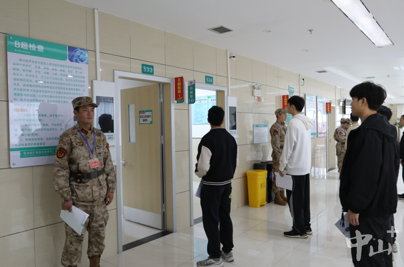 1月20日,中山市2024年上半年征兵體檢在火炬開發(fā)區(qū)人民醫(yī)院開啟,預計體檢時間將持續(xù)2周以上。 早上7時許,在火炬開發(fā)區(qū)人民醫(yī)院門診五樓,中山市征兵辦工作人員對照名冊開始人員清點。中山市征兵體檢隊總檢醫(yī)生李燦永介紹,此次征兵體檢面向全市所有鎮(zhèn)街,上站青年預計有1500人左右,其中大學畢業(yè)生有800人左右。當天有100多名大學畢業(yè)生參加上站體檢,體檢項目有外科、內(nèi)科、心電圖等多個項目。 應征青年排隊體檢。記者 王云 攝
