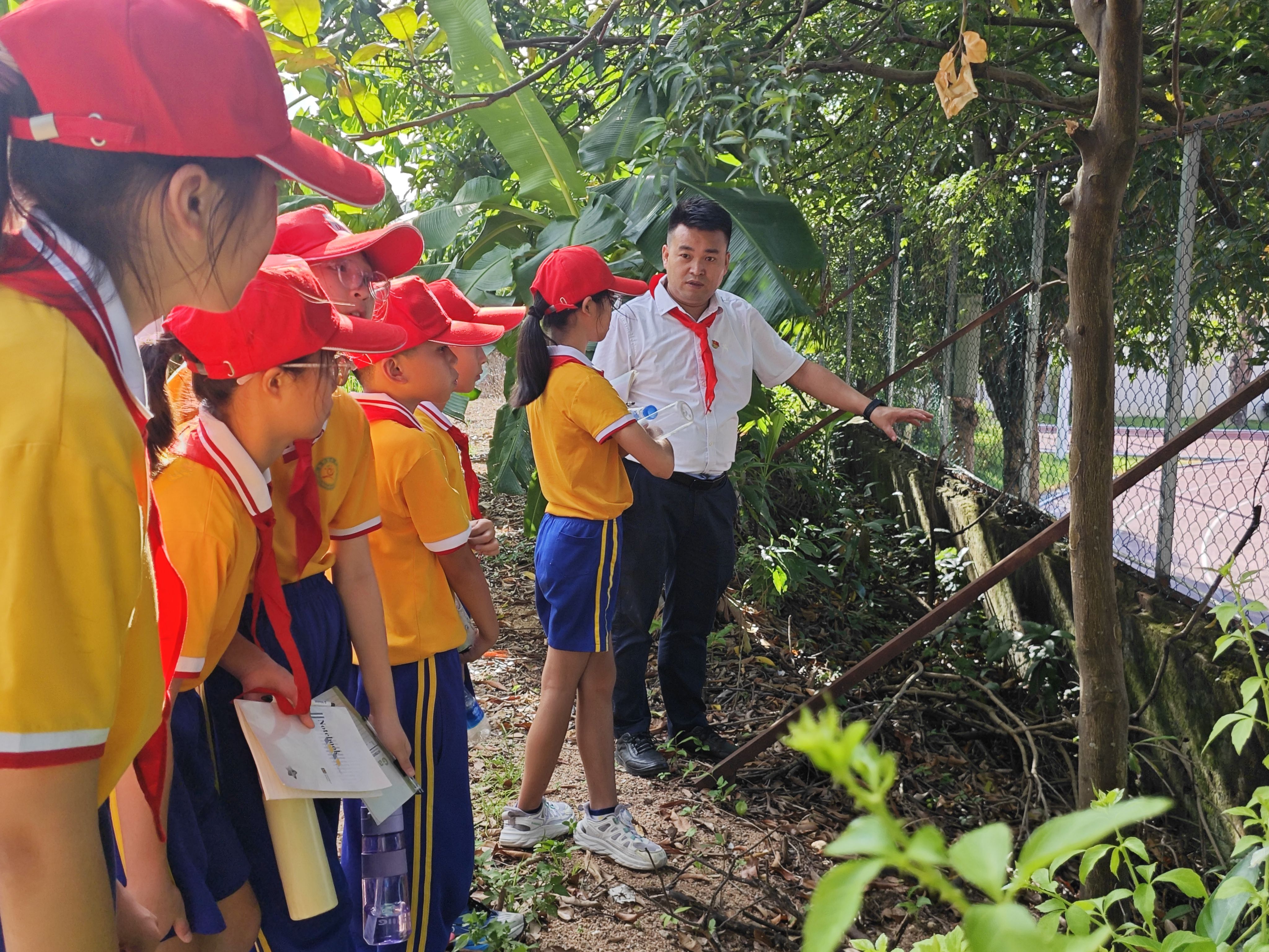 杜少君帶領(lǐng)孩子們到南朗小學(xué)操場(chǎng)保留的帶彈孔的殘墻,講述抗戰(zhàn)往事。簡(jiǎn)文祥 攝
