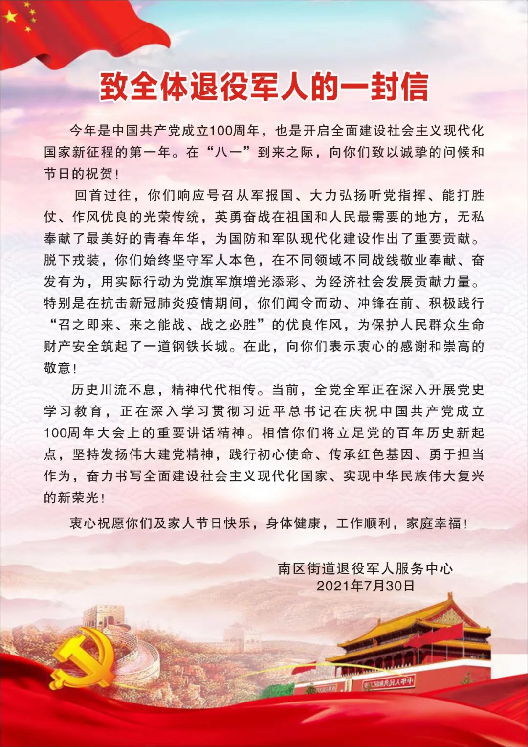 在“建軍節(jié)”來臨之際,南區(qū)街道開展一系列擁軍優(yōu)屬活動,懷著崇敬之心、感恩之心,向優(yōu)撫對象和退役軍人、現(xiàn)役軍人家屬表達(dá)關(guān)懷和謝意,推動軍民共建!