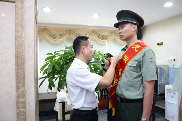 儀式現(xiàn)場,街道領(lǐng)導(dǎo)為退役士兵逐一佩戴象征榮譽的大紅花,致敬他們?yōu)閲朗聵I(yè)作出的貢獻。