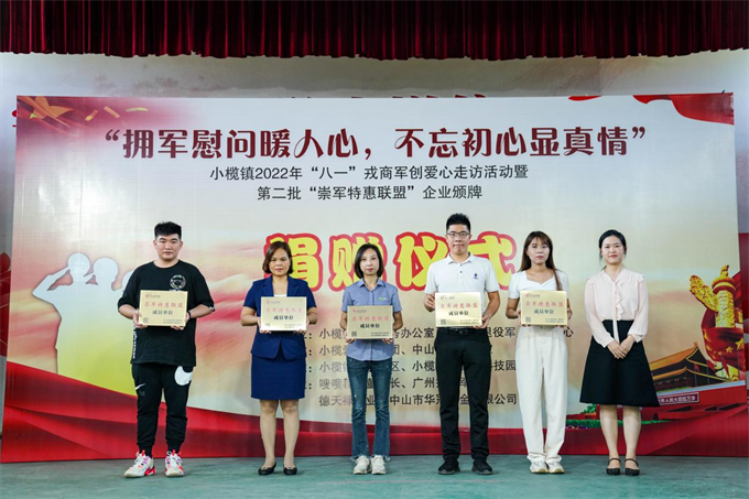 7月24日,小欖鎮(zhèn)舉行“擁軍慰問暖人心,不忘初心顯真情”——2022年“八一”愛心走訪活動(dòng)啟動(dòng)暨第二批“崇軍特惠聯(lián)盟”企業(yè)頒牌儀式。該鎮(zhèn)副鎮(zhèn)長鄧泳標(biāo)、市退役軍人服務(wù)中心副主任高亞男及鎮(zhèn)公共服務(wù)辦、退役軍人服務(wù)中心、高沙社區(qū)、中山好人工作室相關(guān)負(fù)責(zé)人,小欖愛心助學(xué)團(tuán)志愿者、愛心企業(yè)及第二批市“崇軍特惠聯(lián)盟”企業(yè)的代表以及部分優(yōu)秀退役軍人代表近100人參加了活動(dòng)。