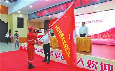 中山市人民政府副市長(zhǎng)曾奕給中山市擁軍支前紅旗服務(wù)隊(duì)授旗。 楊啟寧 攝