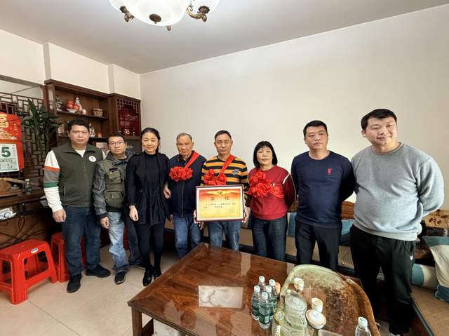 ▲黨委委員徐國勝帶隊為溪角社區(qū)“四有”優(yōu)秀軍官戴維駿家屬送上喜報
