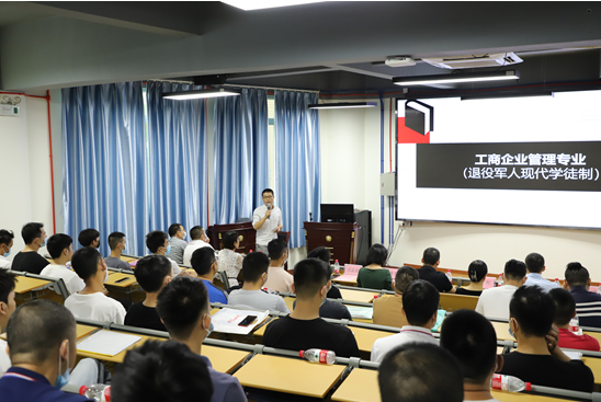 “狹路相逢勇者勝,在座的各位從繁忙的工作崗位上走出來(lái),邁出繼續(xù)學(xué)習(xí)的關(guān)鍵一步,勇氣可嘉。三年后,相信大家一定會(huì)收獲知識(shí)、技能、學(xué)歷,更好地開(kāi)啟新征程?!蓖艘圮娙爽F(xiàn)代學(xué)徒制項(xiàng)目開(kāi)學(xué)典禮上,經(jīng)管學(xué)院院長(zhǎng)肖紅在致辭中對(duì)新生們表示歡迎和祝賀,并表達(dá)了殷切期望,希望大家在求學(xué)期間,修德修身、克勤克儉、心懷理想,腳踏實(shí)地,融入多姿多彩的校園生活,在學(xué)生當(dāng)中彰顯軍人本色和榜樣力量。 市退役軍人事務(wù)局相關(guān)負(fù)責(zé)人對(duì)項(xiàng)目順利開(kāi)班表示祝賀,對(duì)學(xué)院在項(xiàng)目申報(bào)、招生等工作中的辛勤付出表示衷心感謝。他介紹了項(xiàng)目實(shí)施的背景,指出開(kāi)展退役軍人現(xiàn)代學(xué)徒制教育,是退役軍人安置工作的一項(xiàng)重要內(nèi)容,通過(guò)現(xiàn)代學(xué)徒制,讓大家成為全日制大學(xué)生,進(jìn)行正規(guī)系統(tǒng)的高等職業(yè)教育,是黨和政府送給同學(xué)們的一份沉甸甸的“大禮包”。同時(shí),要求新生們盡快適應(yīng)由士兵到大學(xué)生的角色轉(zhuǎn)變,勤學(xué)善思,掌握就業(yè)創(chuàng)業(yè)本領(lǐng),發(fā)揚(yáng)軍隊(duì)能打勝仗的優(yōu)良傳統(tǒng),爭(zhēng)創(chuàng)佳績(jī),為祖國(guó)和地方經(jīng)濟(jì)建設(shè)再立新功。 學(xué)院工商管理專(zhuān)業(yè)主任沈孟康介紹了學(xué)校和學(xué)院概況,就學(xué)生日常管理、教學(xué)內(nèi)容、方式和計(jì)劃等作詳細(xì)說(shuō)明。表示學(xué)校將采取在崗培養(yǎng)與學(xué)校培養(yǎng)相結(jié)合,堅(jiān)持“標(biāo)準(zhǔn)不降、模式多元、學(xué)制靈活”,線上與線下混合教學(xué),實(shí)行工學(xué)交替、靈活多元的教學(xué)模式。經(jīng)管學(xué)院已配備了教授、博士等“精銳”師資團(tuán),“量身定制”人才培養(yǎng)方案,全力保障“八一班”的教育教學(xué)質(zhì)量。