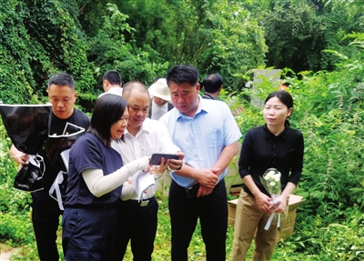 市退役軍人事務(wù)局負責(zé)人向荊門市退役軍人事務(wù)局有關(guān)人士了解甘和順烈士墓的保護情況。通訊員供圖