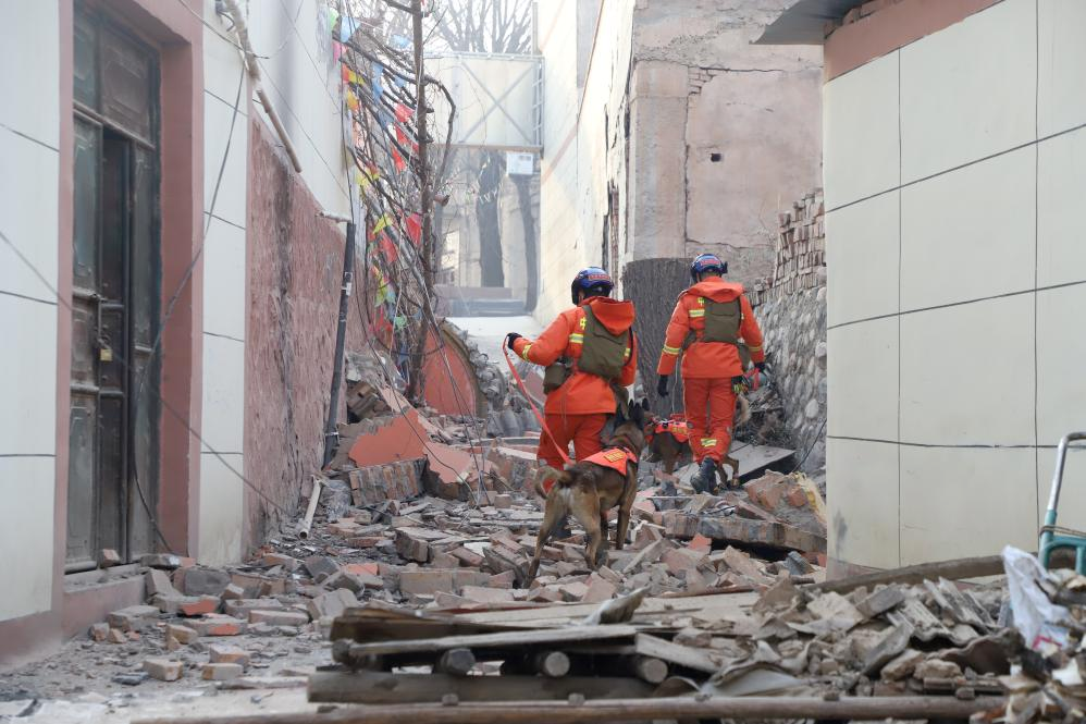 12月19日,甘肅省森林消防總隊(duì)特勤大隊(duì)在積石山縣大河家鎮(zhèn)組織開(kāi)展救援工作。(甘肅省森林消防總隊(duì)供圖 新華社發(fā))