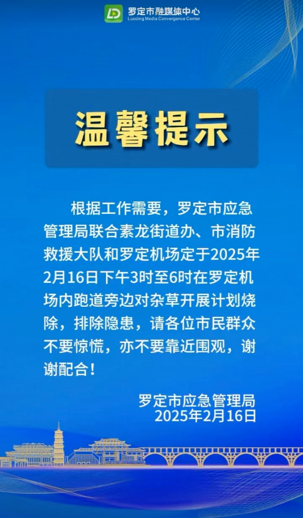 記者查詢(xún)發(fā)現(xiàn),羅定市融媒體中心曾于2月16日發(fā)布一則提示,明確表示羅定機(jī)場(chǎng)將于2025年2月16日下午3時(shí)至6時(shí),在跑道旁開(kāi)展雜草燒除工作,并提醒市民不必驚慌。